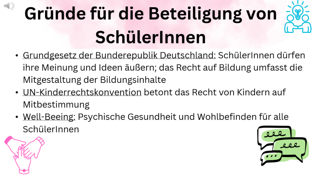 - Offenheit: Eine offene und unterstützende Lernumgebung wird gefördert, in der SchülerInnen sich sicher fühlen, ihre Meinungen und Ideen zu äußern. Der Dialog zwischen LehrerInnen und SchülerInnen ist entscheidend.