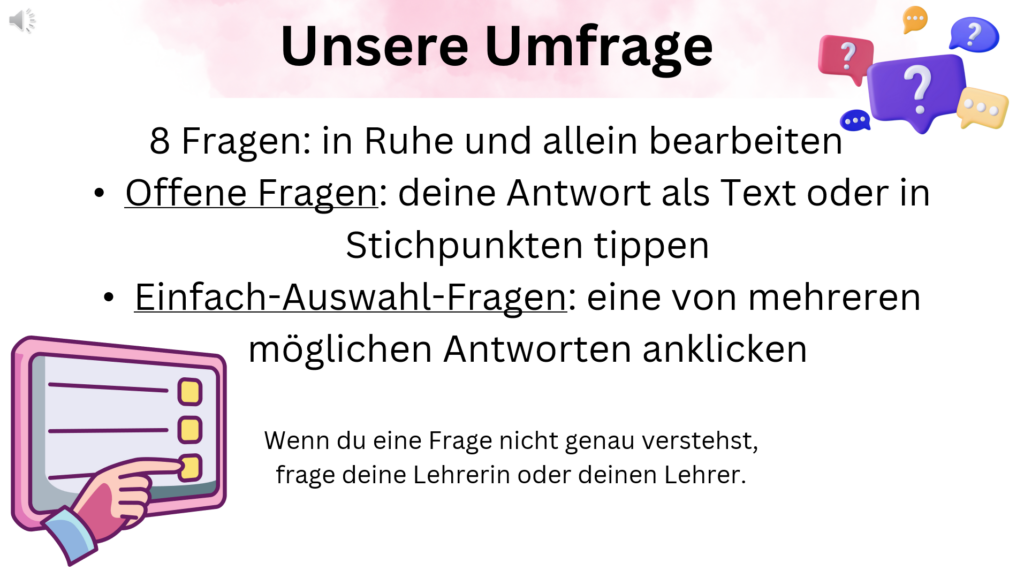- Feedback und Reflexion: Das Feedback und die Ideen der SchülerInnen bilden den Schwerpunkt des Projektes, um die Wirksamkeit der Methoden zu bewerten. LehrerInnen und SchülerInnen reflektieren gemeinsam über die Lernprozesse und passen die Methoden bei Bedarf an.