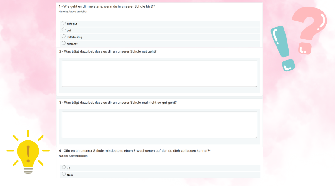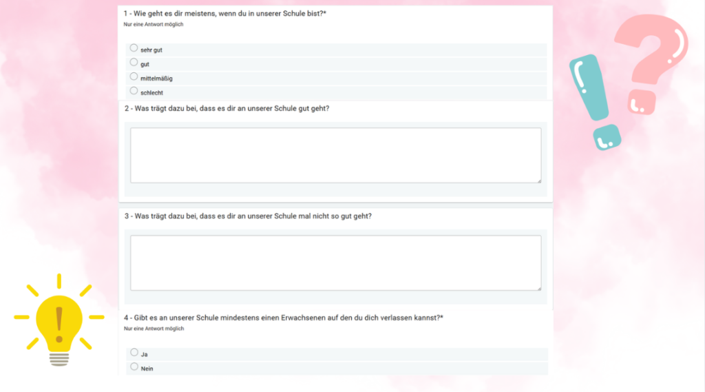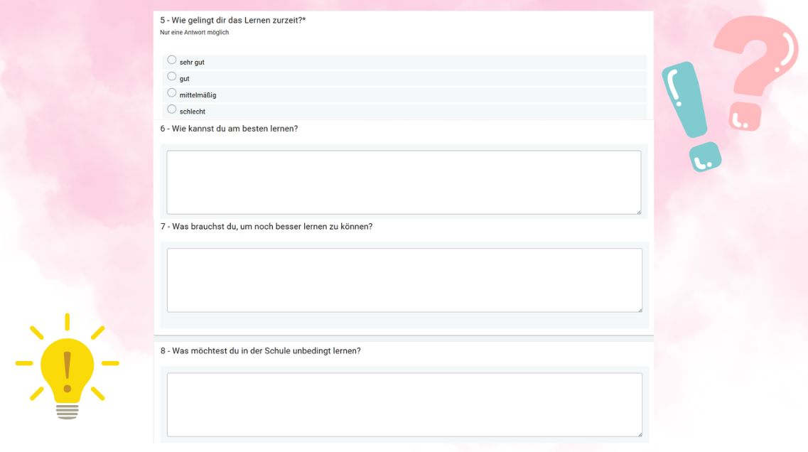 Nachdem die Lerncoaches im letzten Halbjahr Denkanstöße sowie kreative Prozesse zum ersten Teil unseres Leitbildes initiiert haben, stand in den letzten Wochen des Halbjahres der zweite Teil des Leitbildes auf dem Programm der vier SchülerInnen. Um jedes Mitglied der Schulgemeinschaft einzubeziehen, haben sie eine Umfrage erstellt, in der das persönliche Lernen an unserer Schule im Fokus stand. Allein oder mit Begleitung haben die SchülerInnen sehr motiviert acht Fragen zu ihren individuellen Lernerfahrungen beantwortet. Die Ergebnisse stellen einen wichtigen Teil eines größeren Evaluationsprozesses dar, der momentan an unserer Schule stattfindet und dessen Schlussfolgerungen und Bedeutungen am baldigen Workshop-Abend zentral sind.
